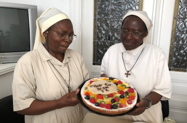 Jubilé d’or, 50 ans de vie religieuse de srs Kizito et Denise Agnès. Jour d’allégresse et de joie, jour de louange et d’action de grâce ! Kizito et Denise ont plusieurs points en commun et Dieu a fait qu’elles célèbrent ensemble leur jubilé d’or. Nos deux sœurs sont toutes nées le 02 février. Elles ont toutes commencé la formation à la vie religieuse le même jour et ont fait ensemble leur première profession le 1er juillet 1968. Elles ont toutes été fondatrices l’une au Congo en 1969, l’autre en Côte d’Ivoire en 1985. Aujourd’hui elles célèbrent ensemble leur jubilé d’or au cours d’une même action de grâce ! (voir quelques photos de la célébration)
